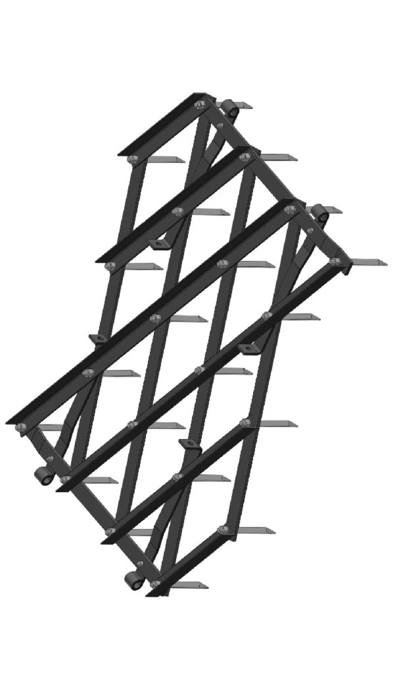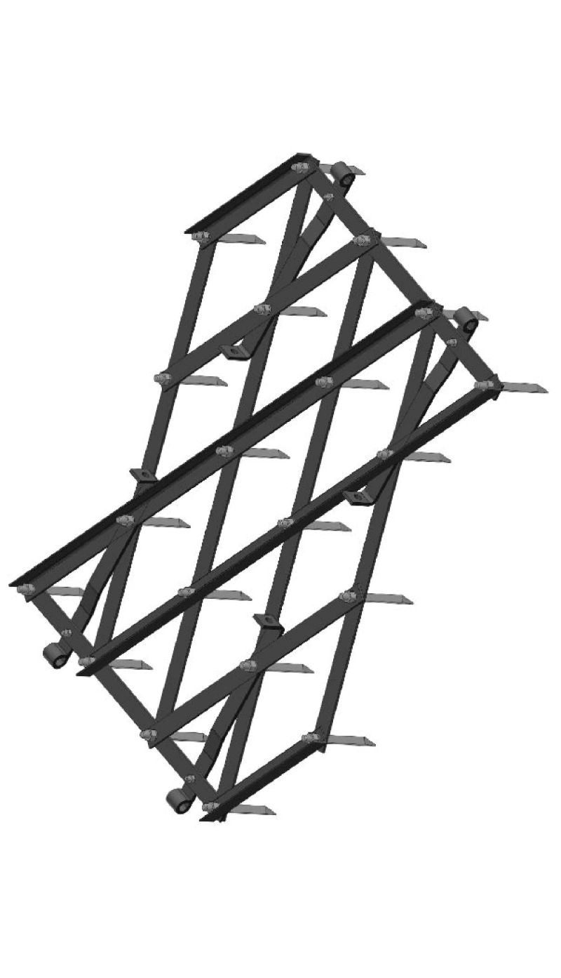Несущий брус изготовлен из профильной трубы 150х150х8 мм. Брус сницы из трубы 150х100х8 мм, грядели 80х60х5 мм. Выдерживает нагрузки, длительный срок службы. Благодаря высокому расположению брусьев, борона не забивается растительными остатками.
