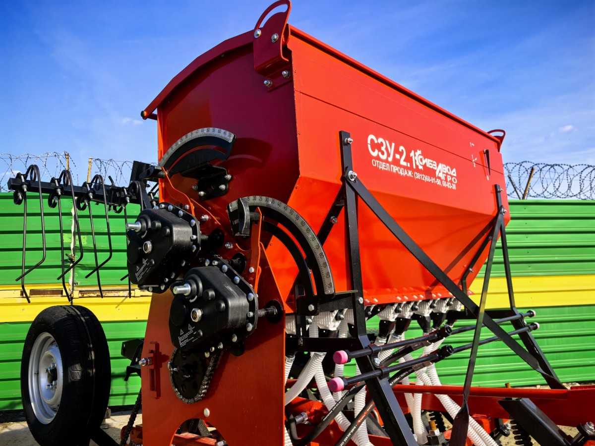 Установлен универсальный высевающий аппарат с двухсекторными катушками, два 4-х кулачковых бесступенчатых вариатора и увеличенный зернотуковый бункер. На универсальную сеялку СЗУ-2,1 возможна установка 4 видов прикатывающих катков: кольчато-шпоровые, клиновые, узколенточные и пневматические.